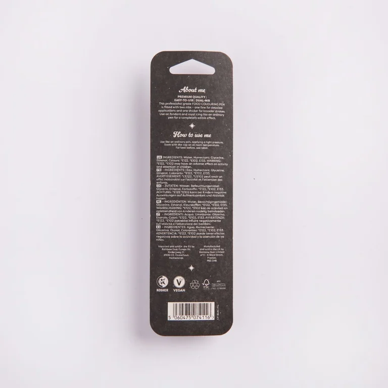 De RD Food Art Pen - Jet Black is een veelzijdige eetbare stift die onmisbaar is voor het decoreren en personaliseren van je bakcreaties. Deze pen is tweezijdig te gebruiken, met aan de ene kant een fijne punt van 0,5 mm voor gedetailleerd werk en aan de andere kant een bredere punt van 2,5 mm voor accenten en inkleuring.